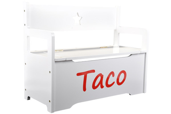 Houten opbergbank van het merk Bandits & Angels. Stevig bankje met een formaat van 60 x 27 x 47 cm (lxbxh). Voorzien van een rugleuning en met een zithoogte van 24 cm. Al je speelgoed is snel en gemakkelijk op te bergen, onder de zitting zit namelijk een opbergruimte van 57 x 22 x 20 cm. Ideaal voor het opbergen van je favoriete speelgoed. De naamsticker is optioneel.